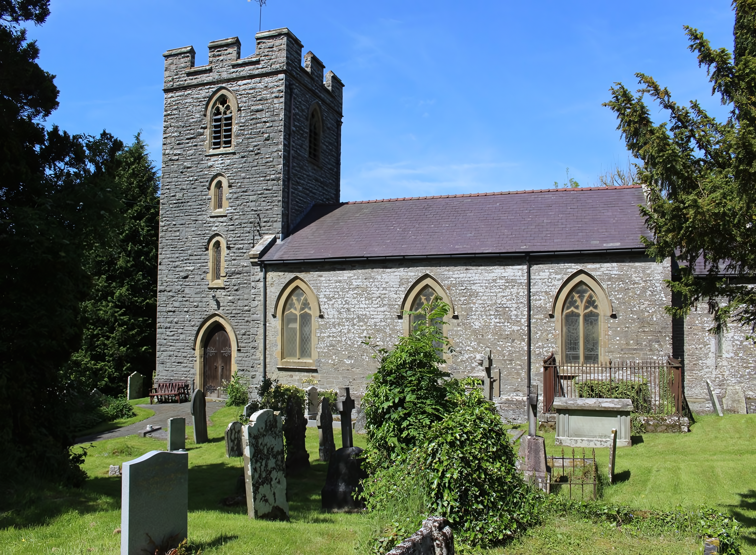 One of the churches dedicated to St. Michael which surround the Radnor Forest its origins are not known. Rebuilt by Benjamin Wishlade in 1833 and added to in 1891 – 1930. For some time linked with Llanddewi with which it shared an incumbent for some years. Monuments to the Moore family of Old Hall. A peal of six bells. Large pipe organ added in recent years, The Old Vicarage was sold and the parish ceased to have a resident priest in 1960. The village school started in the vestry in about 1834 and later transferred to the Toll House. The church serves the community of Dolau.