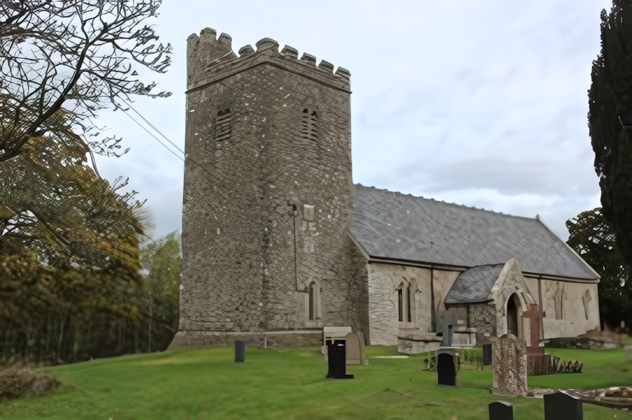 A medieval foundation restored in 1887 in a large circular churchyard with ancient yew trees. The burial place of Thomas Huet, one of the translators of the Welsh New Testament in 1567.